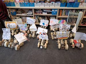 In science we learned about the wheel and axle, then spent the week making wind cars. We raced them on Friday, with some students getting over 5m.