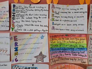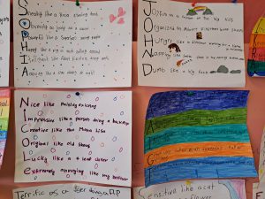 In language arts we worked more on similes and metaphors, first by finding them in the Grinch song, then by making acrostic poems about ourselves, this time using more poetic devices.